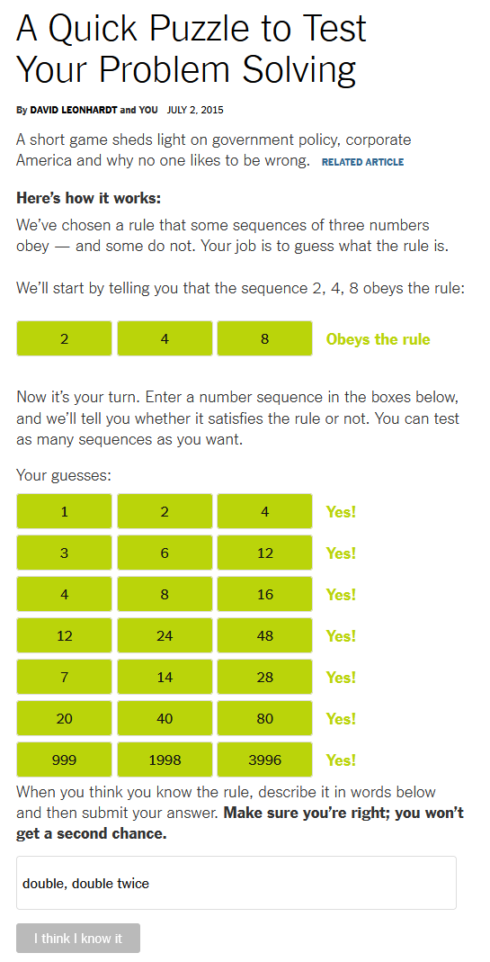 正确答案其实极其简单:每个数字必须比前一个数字大。例如,5、10、20 符合规则,1、2、3 也符合,甚至 -17、14.6、845 同样符合。幼儿园的孩子都能理解这条规则。